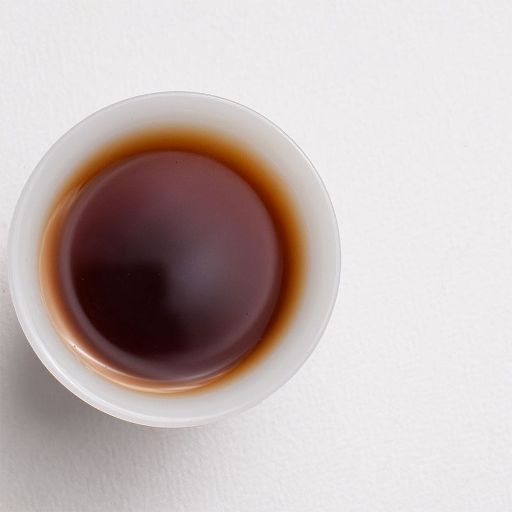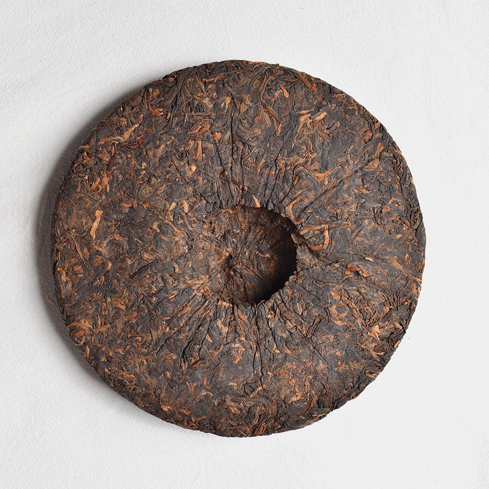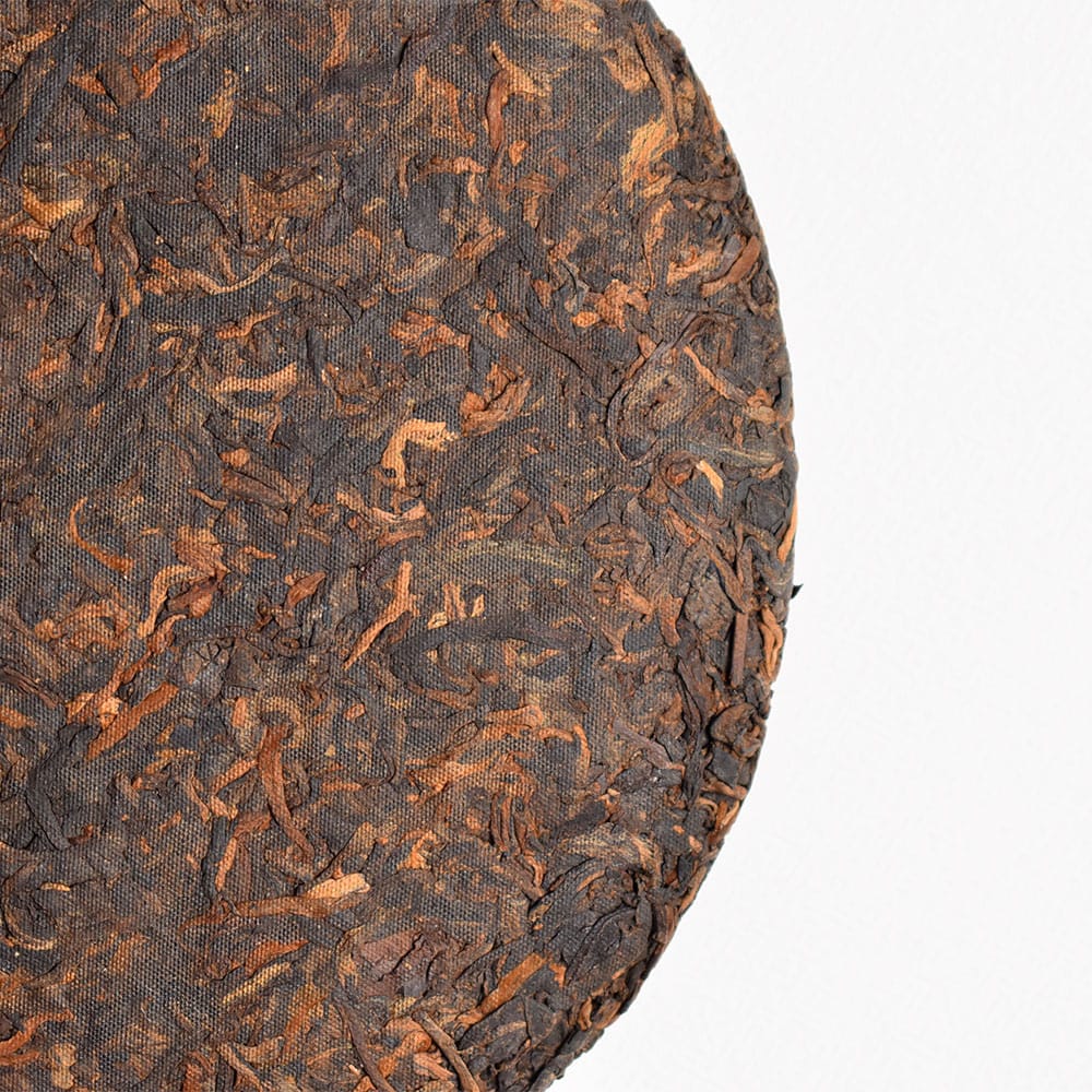 The tea cake is evenly pressed, with clearly defined leaves in deep brown and reddish-brown tones, accented by a small amount of golden-brown buds. The brewed liquor is deep reddish-brown and glossy. On the palate, it offers a distinct rice-soup-like smoothness, layered with gentle grain sweetness and warm woody notes. A subtle floral nuance typical of Bulang Mountain material appears quietly in the background, followed by a clean, lingering sweetness.