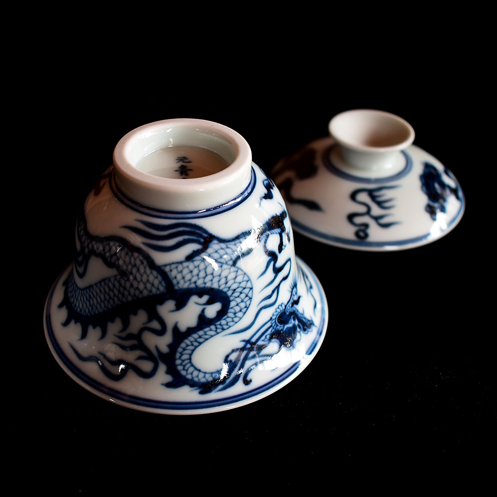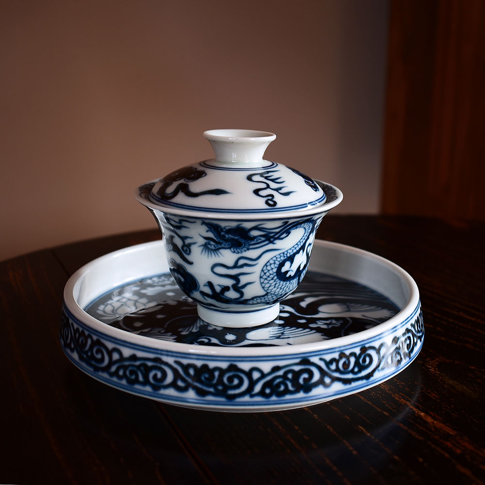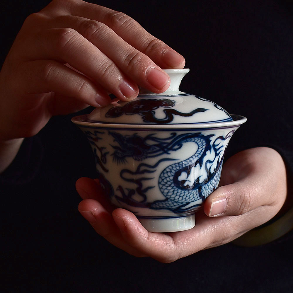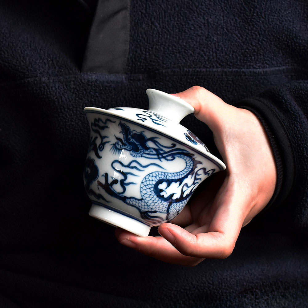 This exquisite gaiwan is crafted in Jingdezhen using the traditional Yuan-style underglaze blue technique. Its form is dignified and balanced, exuding a strong classical charm. The bowl’s silhouette is full and upright, with a gently flared rim and lotus-like curves that rest comfortably and securely in the hand.