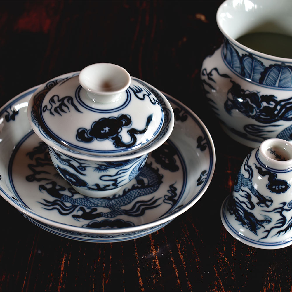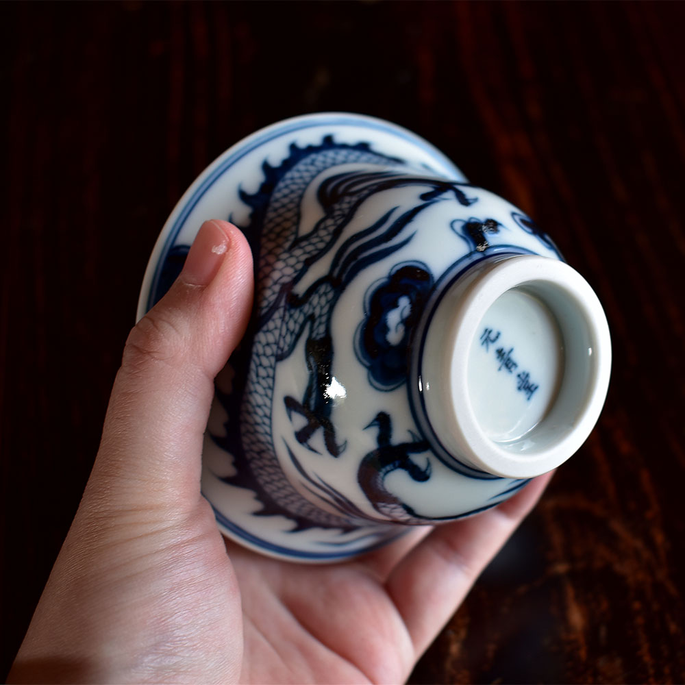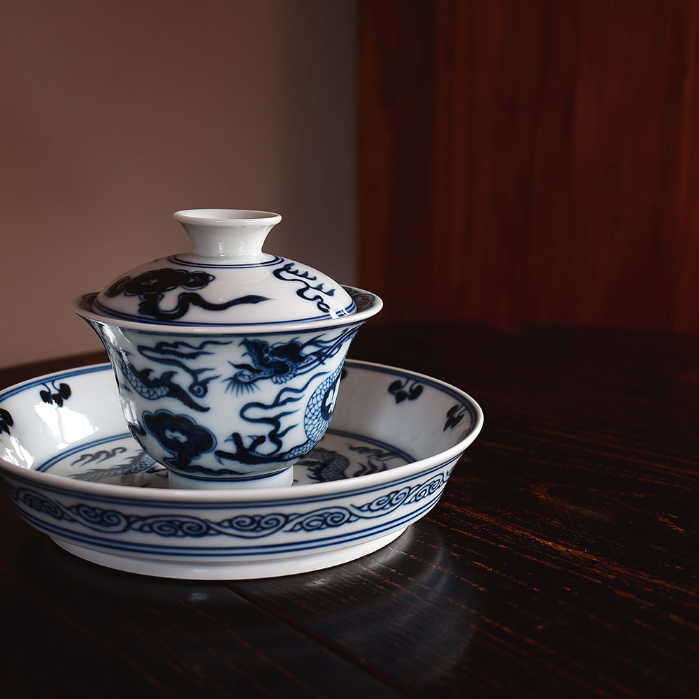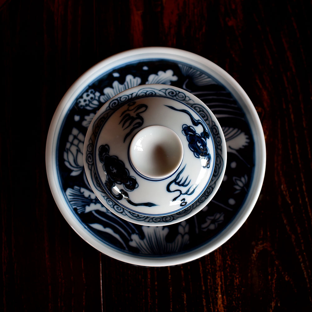 This exquisite gaiwan is crafted in Jingdezhen using the traditional Yuan-style underglaze blue technique. Its form is dignified and balanced, exuding a strong classical charm. The bowl’s silhouette is full and upright, with a gently flared rim and lotus-like curves that rest comfortably and securely in the hand.