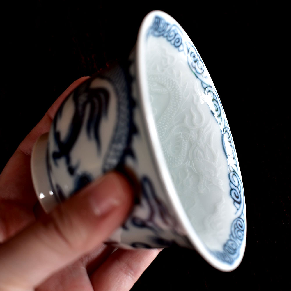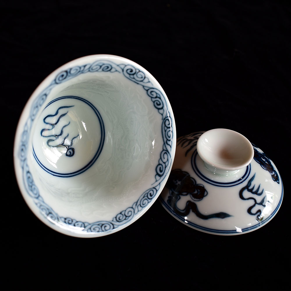 What truly sets this gaiwan apart is the inner wall, where an entire coiled dragon is meticulously incised beneath the glaze using a refined carving technique. The design emerges subtly through the translucent porcelain, revealing itself softly in changing light—like a dragon gliding beneath the surface of the tea. This hidden artistry adds a sense of mystique and elegance to the tea-drinking experience, blending function with poetic beauty.