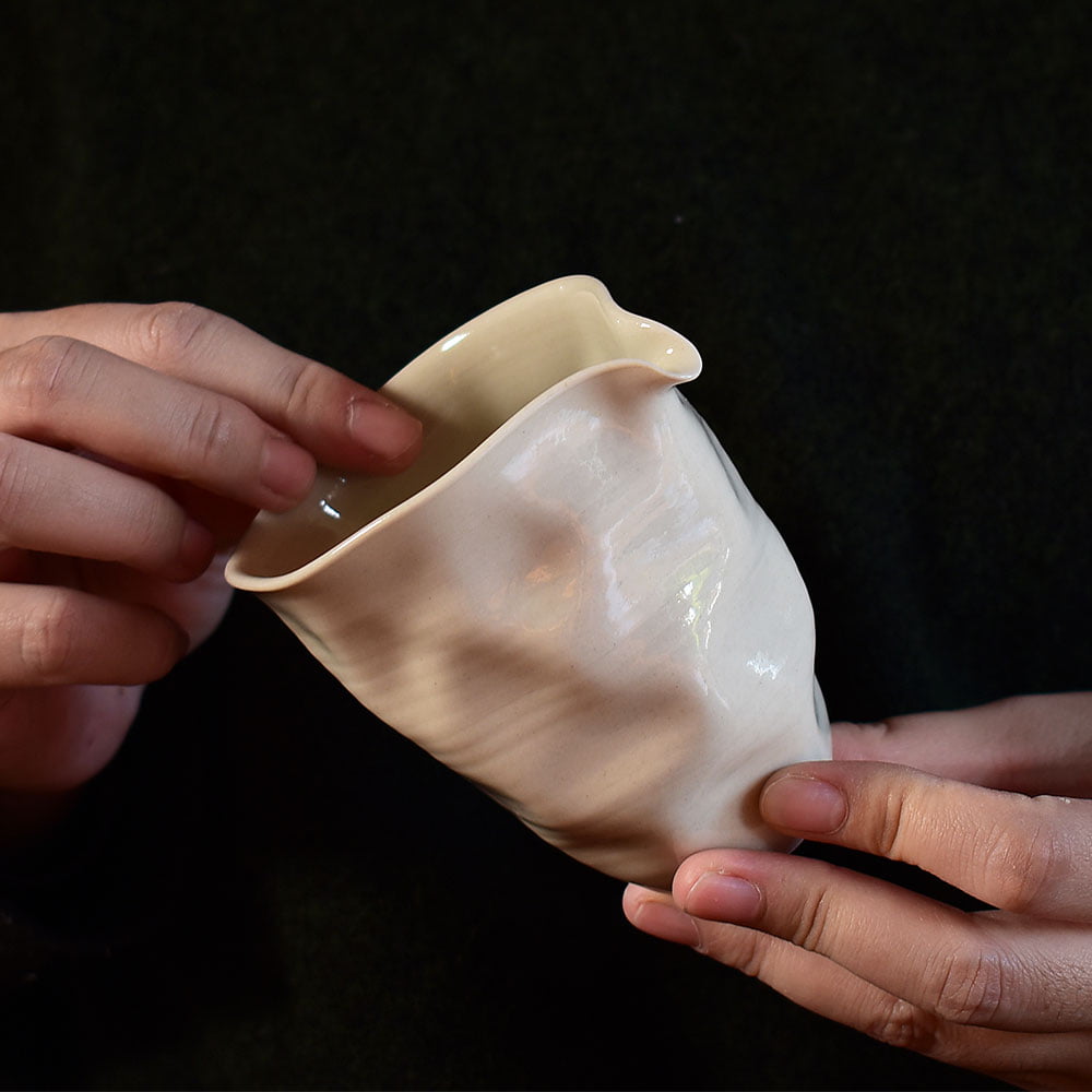 The unique shape created by the hand-pinching process gives the fair cup an individual character and charm. Each piece would be slightly different, with its own organic curves, asymmetries, and irregularities. These variations would make it even more special and add to its natural beauty.