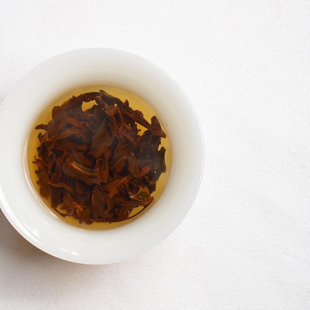 The finished tea is dark and tightly rolled, with a bright orange-red liquor and a pure, elegant peach-floral fragrance.
