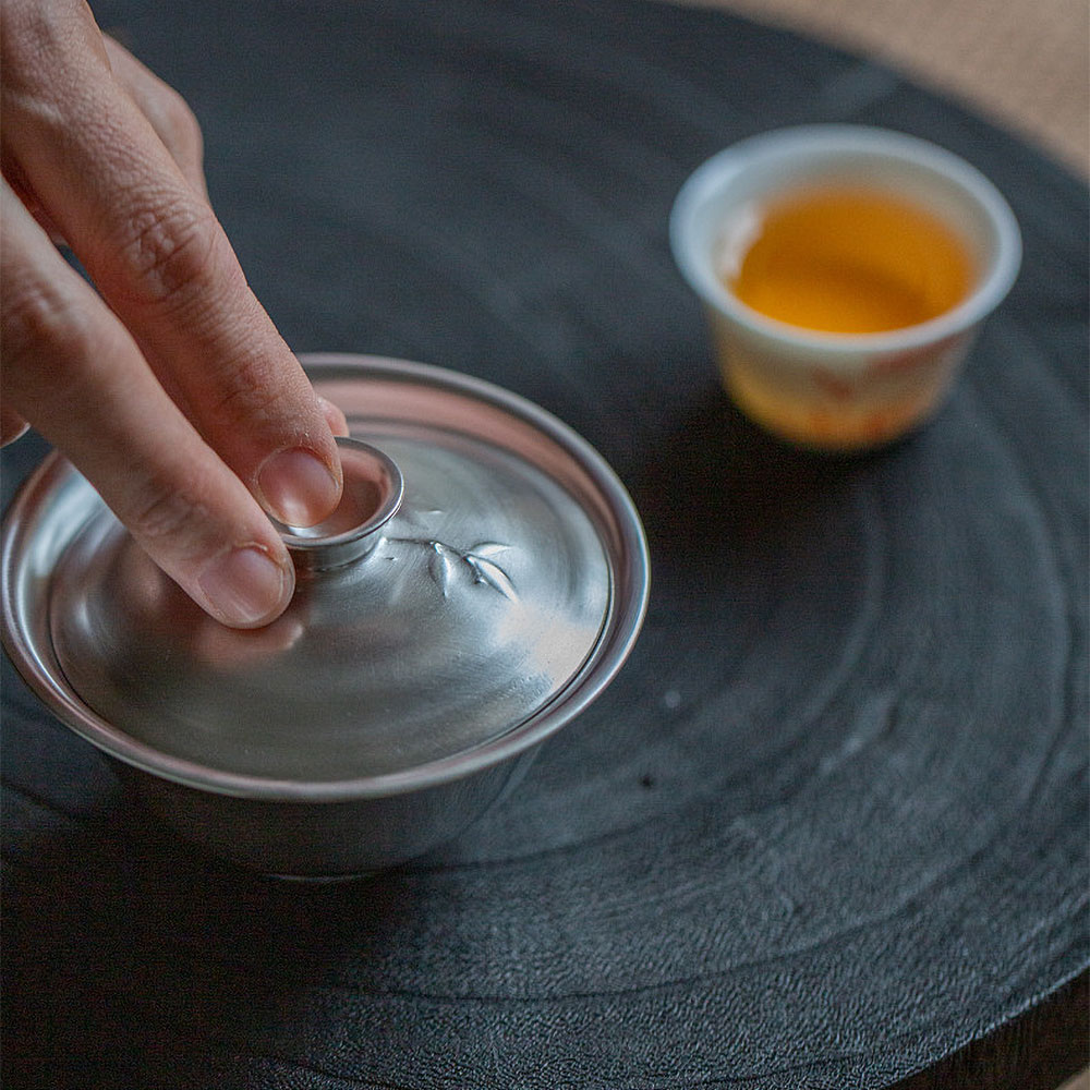 This gaiwan is made with a porcelain body coated in silver gilding, giving the surface a refined texture and a subtle metallic sheen. The lid is delicately engraved with bamboo leaves, appearing faintly like bamboo shadows under the moonlight, evoking a sense of quiet elegance. The form is upright and balanced: the rim slightly flares outward, the body is full and rounded, and the foot ring is steady, presenting a simple yet dignified presence on the tea table.